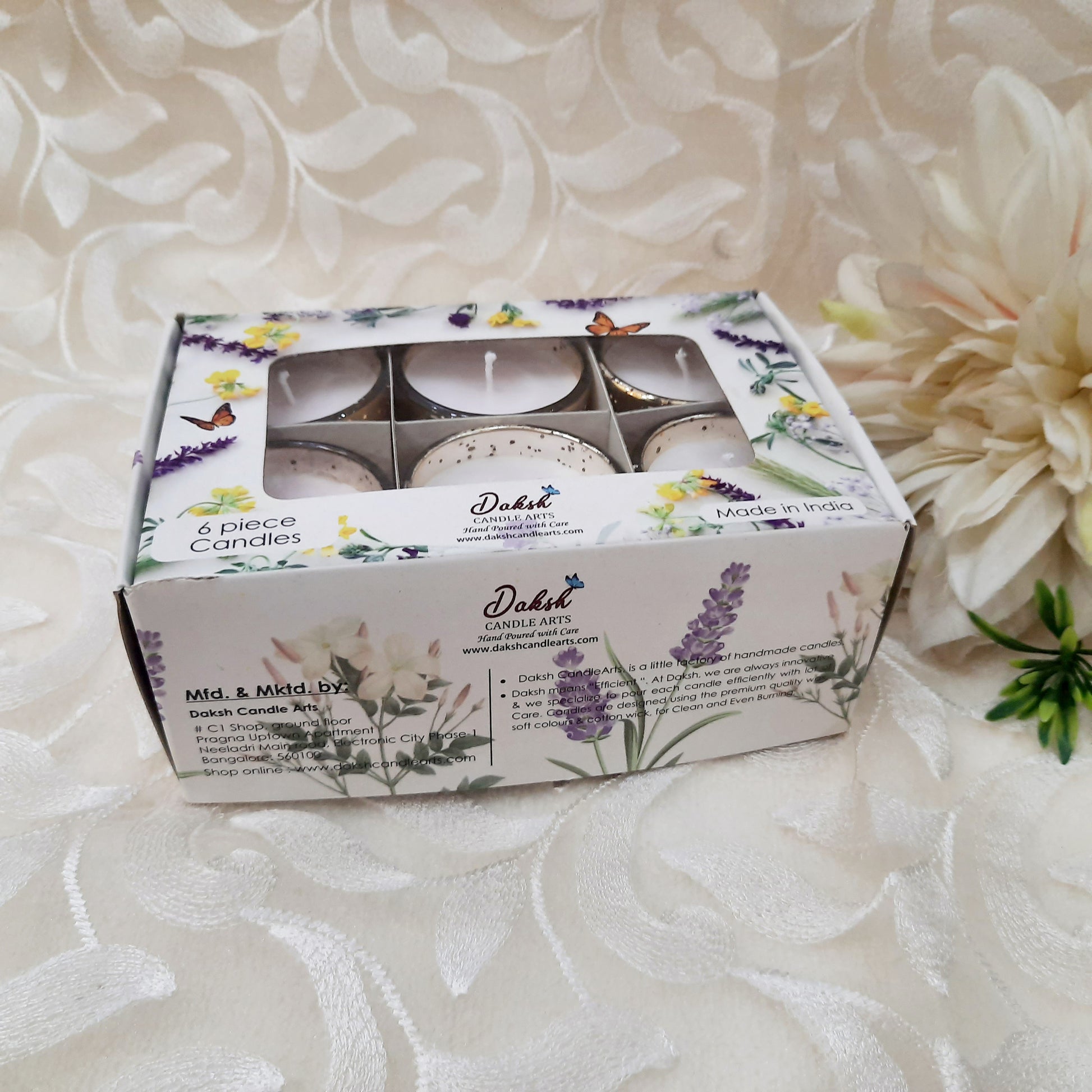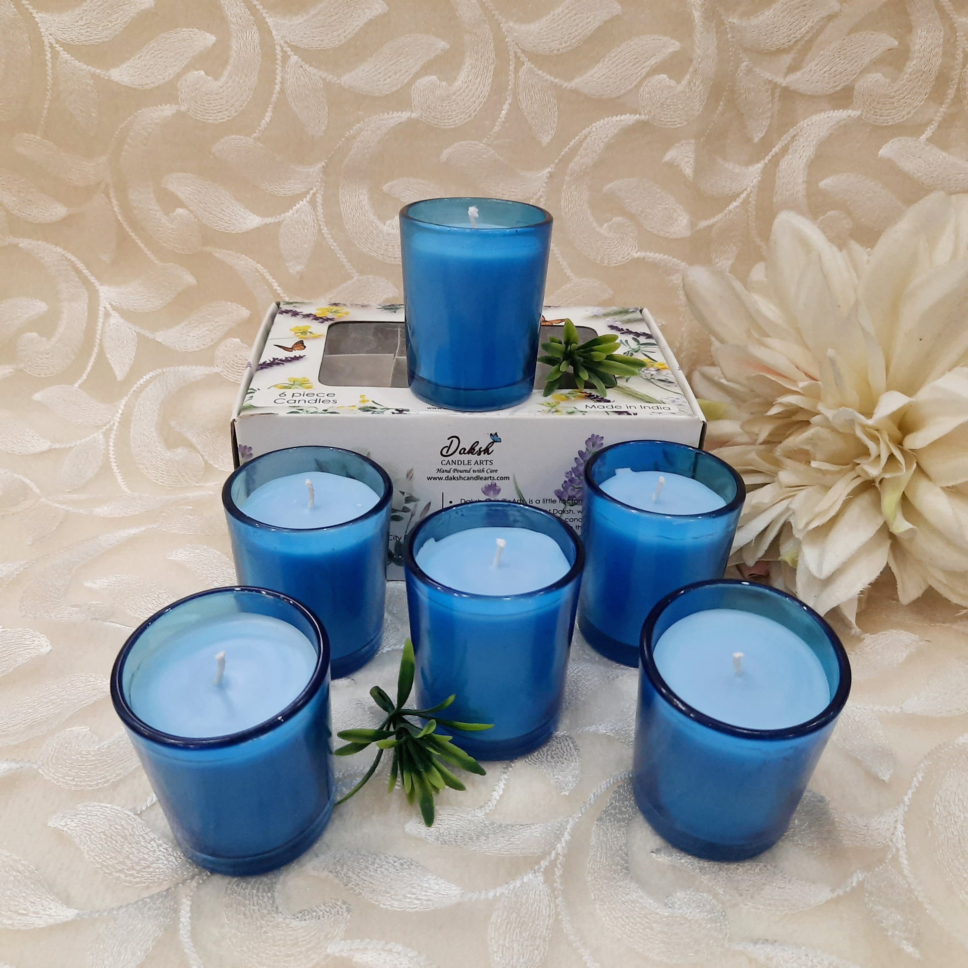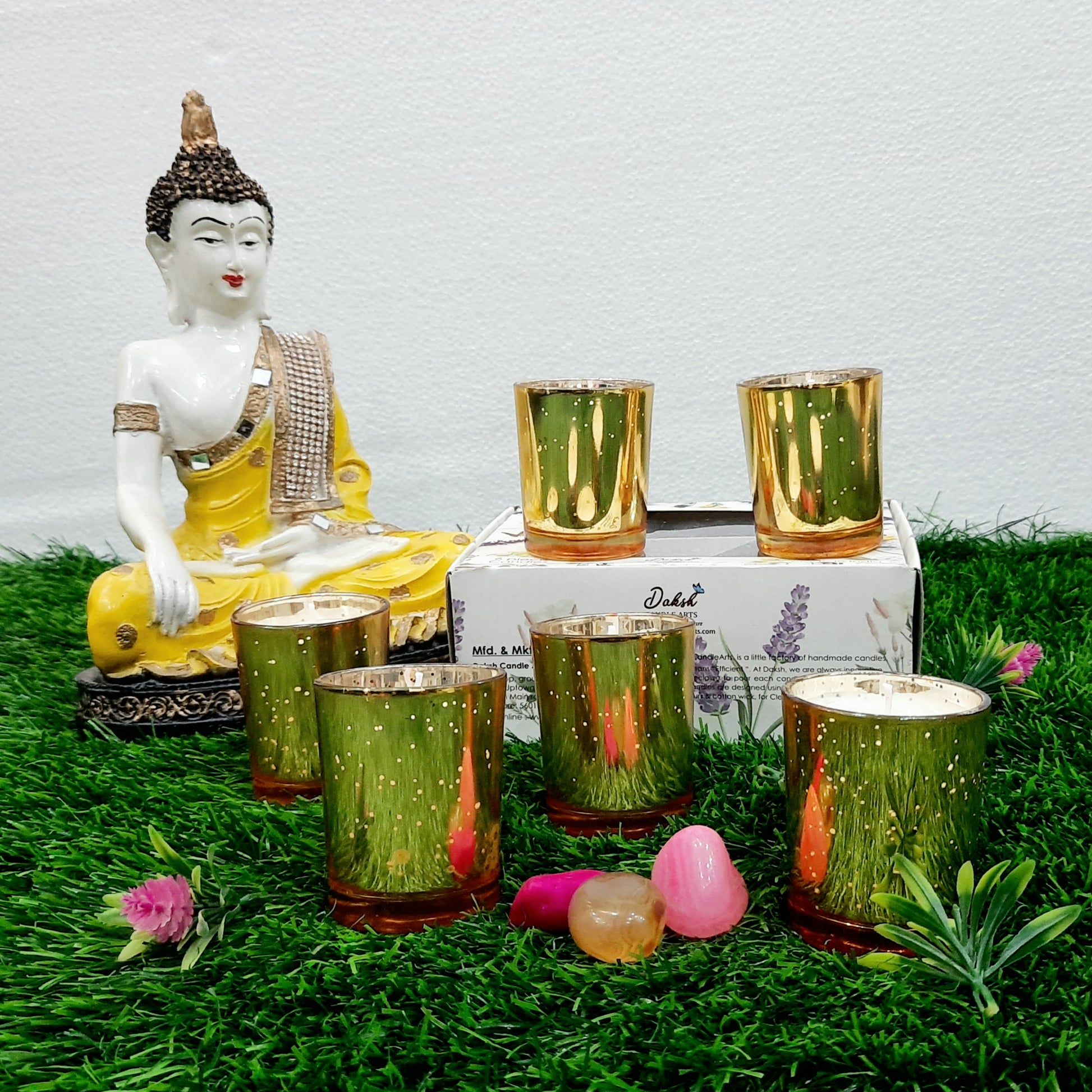 Description: "Daksh CandleArts" Lavender Scented Golden votive candles Set of 6 is Hand poured premium glass votives candles are created with premium quality wax with 10 hrs of burning time. These Golden Votives would be an excellent choice to be decorated to match your custom wedding décor, gift hampers, Birthday parties and bring elegance to any ambiance and give a sophisticated look .